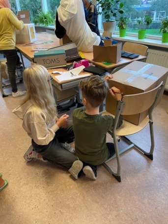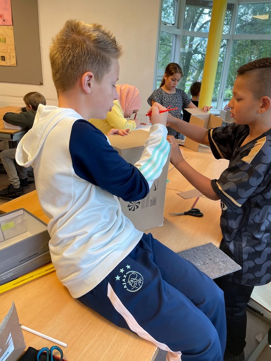 Er wordt ook gewerkt aan een toren van huizen, gemaakt van dozen. Tijdens het knutselen worden er allerlei vaardigheden aangesproken bij de kinderen. Ze mogen zelf kiezen of ze willen samenwerken of dat ze alleen willen werken. Hierbij gaat het spreekwoord op: Alleen ga je sneller, maar samen kom je verder. De kinderen leren steeds beter om elkaars kwaliteiten te benutten. Dat vraagt afstemming en het uitwisselen van ideeën. Bij het knippen, snijden en plakken wordt het ruimtelijk inzicht en een vaardige motoriek van de handen geoefend. Tijdens het werken lijkt onze klas wel een bijenkorf en bij alle kinderen borrelt creativiteit en enthousiasme op. Heerlijk om te zien en het voelt net als bij ons thuis.